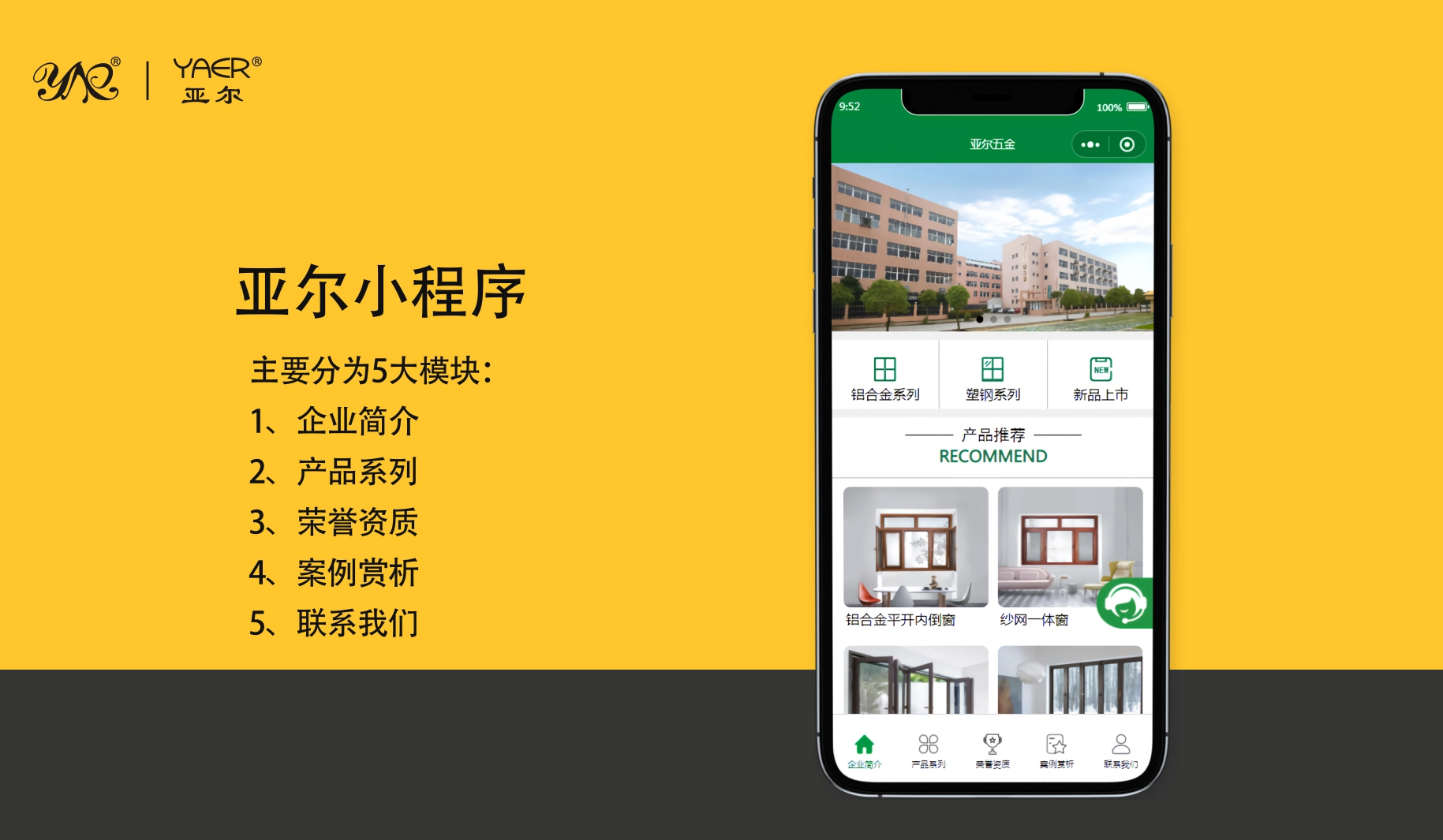 整體的UI設(shè)計(jì)以亞爾環(huán)保綠色系VI系統(tǒng)打造,整個(gè)小程序采用了響應(yīng)式的交互設(shè)計(jì)。目前亞爾小程序主要展現(xiàn)了“企業(yè)簡(jiǎn)介、產(chǎn)品系列、榮譽(yù)資質(zhì)、工程案例、視頻庫”“產(chǎn)品圖庫”等版塊,并開發(fā)了亞爾客服懸窗功能,方便客戶隨時(shí)在線咨詢,后期我們也將會(huì)推出更多版塊。