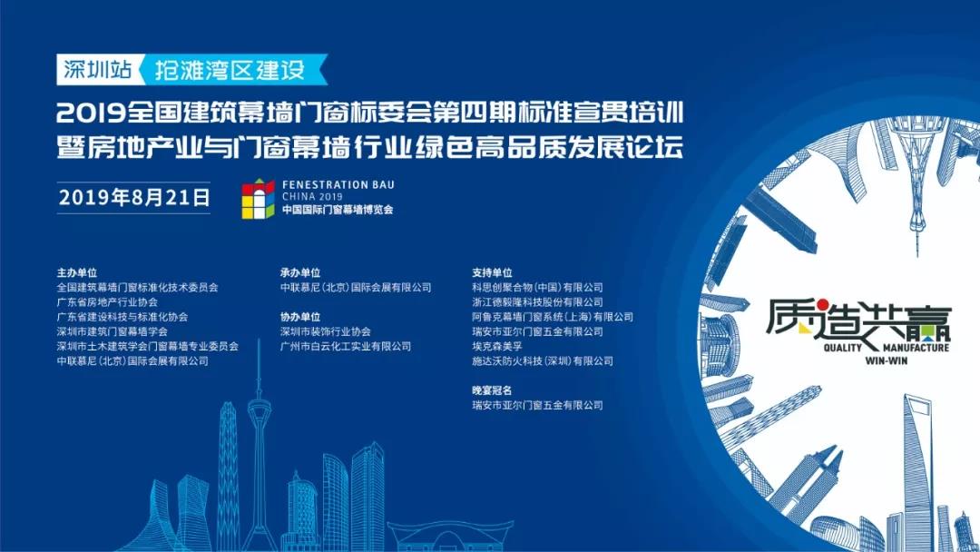 2019年8月21日,由全國建筑幕墻門窗標(biāo)準(zhǔn)化技術(shù)委員會(huì)、廣東省房地產(chǎn)行業(yè)協(xié)會(huì)、廣東省建設(shè)科技與標(biāo)準(zhǔn)化協(xié)會(huì)、深圳市建筑門窗幕墻學(xué)會(huì)、深圳市土木建筑學(xué)會(huì)門窗幕墻專業(yè)委員會(huì)、中聯(lián)慕尼(北京)國際會(huì)展有限公司共同主辦,深圳市裝飾行業(yè)協(xié)會(huì)、廣州市白云化工實(shí)業(yè)有限公司協(xié)辦的2019全國建筑幕墻門窗標(biāo)委會(huì)第四期宣貫培訓(xùn)暨搶灘灣區(qū)建設(shè)—房地產(chǎn)業(yè)與門窗幕墻行業(yè)綠色高品質(zhì)發(fā)展論壇在深圳隆重召開!